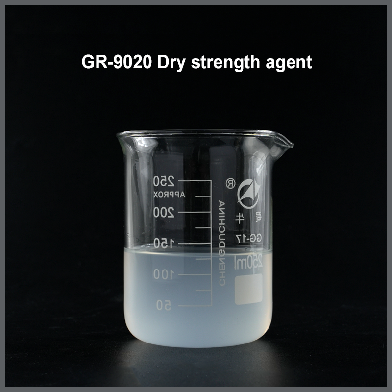 GR-9020 is a new dry strength agent, developed with advanced international technology, enhances paper strength through a networked polymer structure. It increases hydrogen bonding between fibers while its flexible long-chain polymers improve bond toughness. By chemically bridging fibers, it effectively boosts tensile, burst, and tear strength.